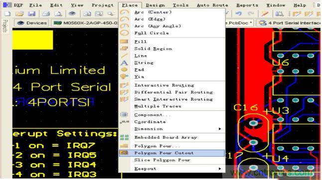 有時(shí)我們在鋪完銅之后還需要去刪除一些碎銅,現(xiàn)在可以很方便的實(shí)現(xiàn),點(diǎn)擊 Place—Polygon Pour Cutout