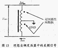 從差模信號看,有中心抽頭的自耦變壓器是兩個在相位上相同的對分繞組,見圖15。這就意味差模電流在其中所形成的磁場,會使其對差模電流呈現(xiàn)高阻抗。相當于對差模信號并聯(lián)了一個高阻值的阻抗,它對差模信號的大小沒有影響。
