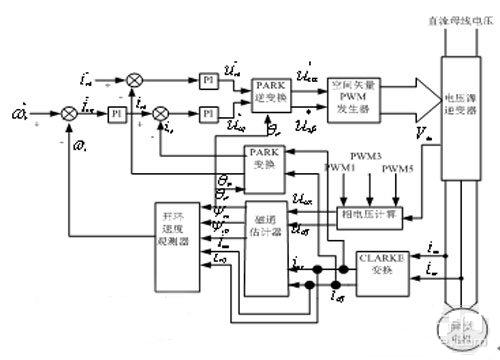 無(wú)速度傳感器的矢量控制就是通過(guò)檢測(cè)異步電機(jī)的相電流和相電壓,采用一定的觀測(cè)技術(shù)觀測(cè)出異步電機(jī)的轉(zhuǎn)速,作為矢量控制系統(tǒng)中轉(zhuǎn)速閉環(huán)的轉(zhuǎn)速反饋。如圖3所示。