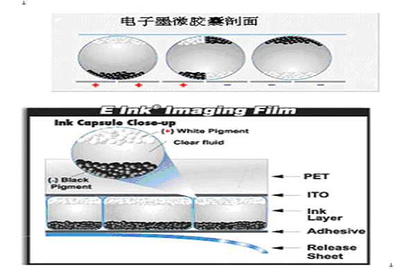 E-Ink的電子紙由電子墨水及兩片基板所組成:第一部分是電子墨水,有時被稱為“前基板(front plane)”;二是使電子墨水生成文本和圖像所需要的電子設(shè)備組合,包括控制部分和顯示部分,被稱為“背基板(backplane)”。背基板上面涂有由無數(shù)微小的透明顆粒組成的電子墨水,顆粒直徑只有人的頭發(fā)絲的一半大小。電子墨水是一種加工成薄膜狀的專用材料,與電子顯示設(shè)備結(jié)合在一起使用,是化學(xué)、物理學(xué)和電子技術(shù)的綜合應(yīng)用。電子墨水由數(shù)百萬個尺寸極小的微膠囊構(gòu)成,直徑與頭發(fā)絲相當(dāng)。每一個微膠囊中含有帶正電荷的白色粒子和帶負(fù)電荷的黑色粒子,它們懸浮在清潔的液體中。 如圖1所示,電子墨水薄膜的頂部是一層透明材料,作為電極端使用;底部是電子墨水的另一個電極,微膠囊夾在這兩個電極間。微膠囊受負(fù)電場作用時,白色顆粒帶正電荷而移動到微膠囊頂部,相應(yīng)位置顯示為白色;黑色顆粒由于帶負(fù)電荷而在電場力作用下到達(dá)微膠囊底部,使用者不能看到黑色。如果電場的作用方向相反,則顯示效果也相反,即黑色顯示,白色隱藏??梢?,只要改變電場作用方向就能在顯示黑色和白色間切換,白色部位對應(yīng)于紙張的未著墨部分,而黑色則對應(yīng)著紙張上的印刷圖文部分。