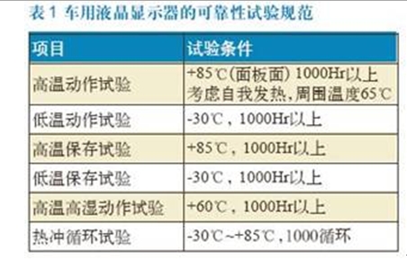 車用液晶顯示器最基本的要求特性就是耐環(huán)境性,表1是車用液晶顯示器的可靠性試驗規(guī)范。隨著汽車廠商的不同,要求條件更嚴苛的耐環(huán)境試驗,例如高溫+ 95℃、低溫-40℃,高溫高濕65℃、濕度90%,試驗時間2000小時等特性,面臨這種情況,業(yè)者利用隨機抽樣樣品進行試驗,確認使用上完全符合耐環(huán)境試驗要求的特性。