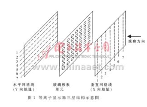 等離子顯示器是一種利用氣體放電的顯示裝置,這種屏幕采用了等離子管作為發(fā)光元件。大量的等離子管排列在一起構(gòu)成屏幕。每個等離子對應(yīng)的每個小室內(nèi)都充有氖氙氣體。在等離子管電極間加上高壓后,封在兩層玻璃之間的等離子管小室中的氣體會產(chǎn)生紫外光,從而激勵平板顯示器上的紅綠藍三基色熒光粉發(fā)出可見光。每個離子管作為一個像素,由這些像素的明暗和顏色變化組合,產(chǎn)生各種灰度和色彩的圖像,與顯像管發(fā)光相似。等離子體技術(shù)同其它顯示方式相比存在明顯的差別,在結(jié)構(gòu)和組成方面領(lǐng)先一步。其工作機理類似普通日光燈,等離子顯示器的三層結(jié)構(gòu)如圖1所示。一般由三層玻璃板組成。在第一層的里面涂有導(dǎo)電材料的垂直條,中間層是燈泡陣列,第三層表面涂有導(dǎo)電材料的水平條。要點亮某個地址的燈泡,開始要在相應(yīng)行上加較高的電壓,等該燈泡點亮后,可用低電壓維持氖氣燈泡的亮度。關(guān)掉某個燈泡,只要將相應(yīng)的電壓降低。燈泡開關(guān)的周期時間是15ms,通過改變控制電壓,可以使等離子板顯示不同灰度的圖形。彩色等離子板目前還處于快速發(fā)展階段。