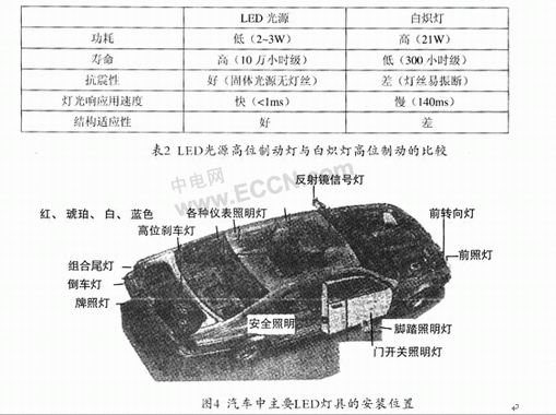 LED在汽車中的應(yīng)用非常廣泛,除車頭前照燈外,其它一些車外和車內(nèi)燈、照明與信號燈、高照度與低照度燈均可采用LED光源,如圖4所示。