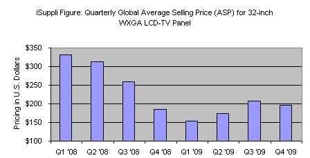 32英寸WXGA LCD電視面板可以代表市場趨勢,預(yù)計它在第四季度的平均價格是196美元,比第三季度時的208美元下降5.8%。