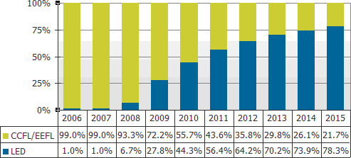 圖一 2006-2015採用傳統(tǒng)CCFL&EEFL燈管與LED背光大尺寸液晶面板出貨比率預(yù)測(cè)
