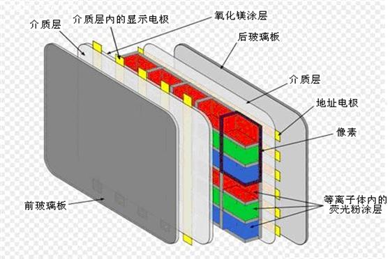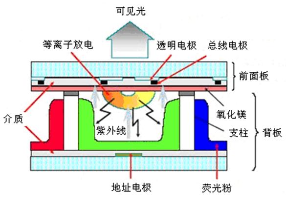 PDP是Plasma Display Panel的簡寫,也就是等離子體顯示器。PDP顯示器的工作原理是,通過加電,讓等離子汽體(一般為惰性氣體)在強電場中放電產(chǎn)生紫外線,然后通過紫外線激發(fā)熒光粉發(fā)光,PDP顯示器的工作原理如圖5所示,其結構如圖6所示。
