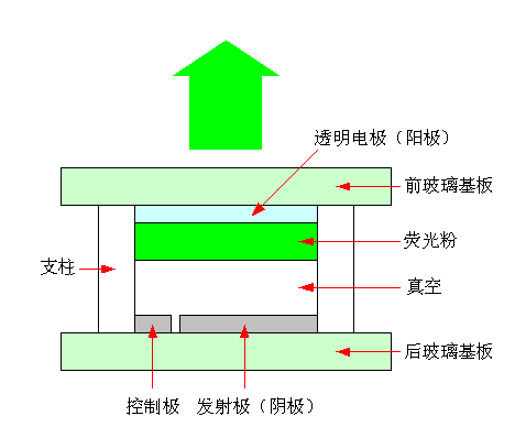 SED(Surface-conduction Electron-emitter Display)顯示器是東芝公司的技術,目前大家都公認,SED顯示圖像的質量水平是最好的。它采用表面?zhèn)鲗щ娮影l(fā)射顯示技術,屬于場致發(fā)射顯示,是一種主動發(fā)光的顯示技術。SED顯示器前玻璃基板上涂有紅、綠、藍三色熒光粉,并作為陽極相對后玻璃基板加有幾千伏的高壓。通過絲網(wǎng)印刷法在后玻璃基板上制作對應每個像素的金屬電極,并用噴墨印刷的方法在金屬電極間制作氧化鈀薄膜電子發(fā)射陰極。生成了氧化鈀膜的金屬電極間距只有4-6納米,當金屬電極間加上十幾伏的電壓后,極間將形成超高電場,氧化鈀膜中的電子會被牽引出來,形成電子發(fā)射。