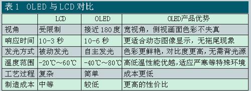 有機(jī)發(fā)光顯示器件之所以受到人們的青睞,是因?yàn)槠渑cLCD為代表的第二代顯示器相比,有著突出的技術(shù)優(yōu)點(diǎn)(見(jiàn)表1):