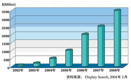 根據(jù)全球權(quán)威平板顯示器(FPD)市場(chǎng)調(diào)研和咨詢(xún)機(jī)構(gòu)DisplaySearch在2004年12月的最新統(tǒng)計(jì)(見(jiàn)表2),OLED行業(yè)2004年全年總收入為3.28億美元,比2003年增長(zhǎng)了41%。上圖為DisplaySearch2004年2月對(duì)全球OLED市場(chǎng)的預(yù)測(cè)。