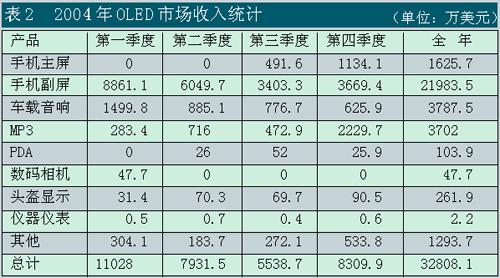 OLED已進(jìn)入的產(chǎn)品領(lǐng)域包括手機(jī)主屏和副屏、汽車(chē)音響、MP3、工業(yè)儀表、PDA、車(chē)載儀表、數(shù)碼相機(jī)和微顯示器(MicrodisplayforNearEyeApplication)等領(lǐng)域。其中,手機(jī)副屏約為2.2億美元,占67%,汽車(chē)音響約為0.38億美元,占11.6%,MP3屏為0.37億美元,占11.3%,這三者共占了約90%。