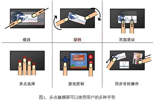 用投射式觸摸屏實(shí)現(xiàn)的幾種常見(jiàn)的多點(diǎn)觸摸手勢(shì)包括手指的張合、縮放、雙指的滑動(dòng)和旋轉(zhuǎn)。它們可以快速方便地處理數(shù)據(jù)、內(nèi)容和用戶參數(shù)。便攜游戲和文本/電子郵件應(yīng)用也可以利用多點(diǎn)觸摸技術(shù)。在一個(gè)多指觸摸過(guò)程中,多觸點(diǎn)APA(全點(diǎn)可尋址)模式可以精確地測(cè)定每個(gè)手指所按壓的坐標(biāo)位置。