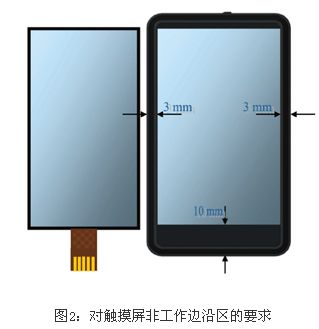 對(duì)尺寸小于4英寸(10厘米)的觸摸屏,觸摸屏的邊沿寬度,在觸摸傳感器尾線一側(cè)應(yīng)不窄于10mm,與尾線側(cè)毗鄰的兩側(cè)應(yīng)不窄于3mm。這個(gè)邊沿空間用于隱藏把透明的ITO圖案鏈接到控制電路的非透明銀質(zhì)箔線并隱藏控制電路本身。對(duì)于使用玻璃基底的觸摸屏,邊沿的寬度或許可以做得更窄,但仍建議使用上述指導(dǎo)原則。圖2 描述了這些指導(dǎo)原則。