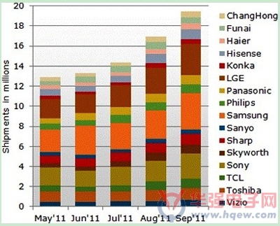 根據(jù)DisplaySearch的 MarketWise-LCD Industry Dynamics 報告,全球前十六大品牌商7月份電視總產(chǎn)量為1,440萬臺,8月份為1,690萬臺,9月份更將提高到1,940萬臺。另一方面液晶電視 OEM / ODM廠商7月份產(chǎn)量估計達(dá)390萬臺,8月份為470萬臺,9月份將達(dá)540萬臺。
