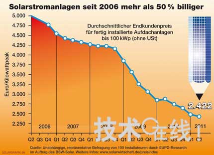 德國太陽能發(fā)電行業(yè)團(tuán)體BSW-Solar宣布,屋頂設(shè)置型太陽能發(fā)電系統(tǒng)2011年第一季度的零售價(jià)(包含安裝工程費(fèi))降到了2006年的一半以下。