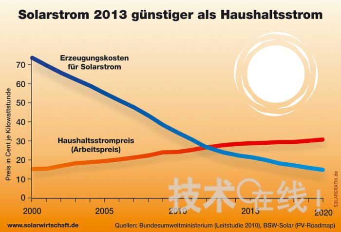 圖2:到2013年,太陽能發(fā)電成本將低于家庭電費(fèi)。圖為德國太陽能發(fā)電的發(fā)電成本(藍(lán)線)與家庭電費(fèi)(紅線)的比較。