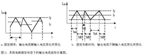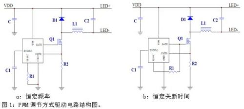 按照PWM調節(jié)方式,可以分成恒定頻率和恒定關斷時間兩類(圖1)。