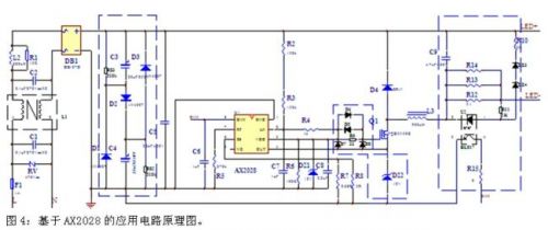 電路采用了EMI抑制電路、整流濾波電路、填谷PFC電路、AX2028恒流系統(tǒng)電路來驅動LED工作。