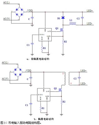 作為一種新型的節(jié)能、環(huán)保的綠色光源產品,LED擁有廣闊的市場前景。市場現(xiàn)階段已經出現(xiàn)上千款LED驅動IC。其中我們遇到比較多的是單芯片線路結構(圖1a)。