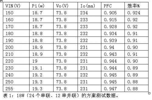 在AX2028_TUBE_18W非隔離應用設計(圖4)中,LED光源陣列設計為0.06W白光LED(SMT或草帽燈)24個串聯(lián)、12串并聯(lián)的方案,驅動288個小功率WLED,總功率為18W。