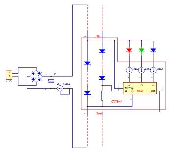 在此電路中,芯片供電利用壓差,電勢(shì)一級(jí)級(jí)的往下降,形成了梯式壓降,故而稱(chēng)壓階傳輸。其實(shí),信號(hào)傳輸也利用了壓階傳輸?shù)姆绞?,芯片與芯片之間的信號(hào)線串接了壓階管,這樣做的目的是經(jīng)過(guò)每一級(jí)后,降低一階信號(hào)電勢(shì),使該級(jí)芯片的信號(hào)與地之間的電勢(shì)差保持正常工作的一個(gè)差值,否則,會(huì)因?yàn)橄鄬?duì)電勢(shì)過(guò)大而燒毀芯片。我們可以注意到這個(gè)電路只要兩條線,一條供電,一條信號(hào)傳輸,供電的線是串行的,所以總線上的電流比較小,用較細(xì)的線就行了。電路的末端,用了一個(gè)CYT1A50,它可以使整個(gè)線路恒流。另一方面,由于它的端口耐壓也比較高,可以將電路上多余的壓降壓在這顆芯片上。