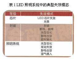 LED模組和燈具的典型失效模式包含了不同層次的失效模式,涉及到LED封裝結(jié)構(gòu)以及工藝過程(如表1)。LED在實際使用中,由于復(fù)雜的環(huán)境以及封裝工藝局限性從而使封裝材料退化、熒光粉退化、金屬電遷移、局部溫度過高產(chǎn)生的熱應(yīng)力所引起的芯片和硅膠的分層或金線斷裂等等,從而影響LED發(fā)光甚至導(dǎo)致整個LED的失效。而且LED產(chǎn)生的高溫會導(dǎo)致芯片的發(fā)光效率降低,光衰加快、色移等嚴重后果。