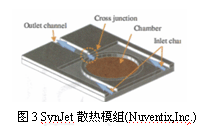 除了熱界面外,主動散熱系統(tǒng)已越來越受企業(yè)的歡迎。圖3給出了SynJet主動散熱模塊,它可以產(chǎn)生脈動空氣,從而可以把LED燈內(nèi)部的熱直接帶到外面。據(jù)了解,SynJet技術(shù)可以幫助設(shè)計師解決一些產(chǎn)品的散熱問題,如電腦產(chǎn)品,特別是高可靠性的LED產(chǎn)品。該技術(shù)有高散熱效率、低噪音、高可靠性和低功耗等優(yōu)點。