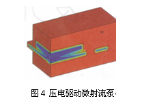 另一種主動冷卻系統(tǒng)是利用壓電驅(qū)動而產(chǎn)生脈動空氣,如圖4所示。該結(jié)構(gòu)簡單,由一個PZT膜片和流動通道構(gòu)成。該流動通道中設(shè)計者重點論述了出口和進口通道的設(shè)計。這種結(jié)構(gòu)允許每一個振動周期中的流體在管道中的阻力和動力差別。