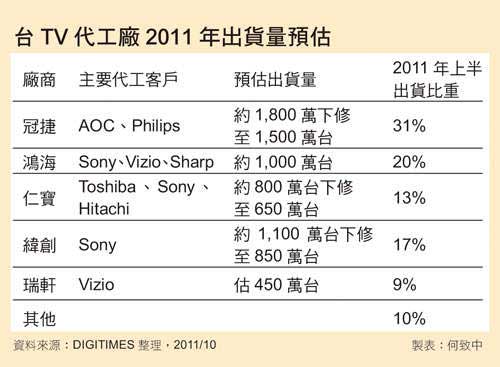 液晶電視制造龍頭冠捷雖握有自有品牌AOC與飛利浦(Philips)品牌訂單,但亦因整體市場需求不佳,下調(diào)2011年出貨量,從原先1,800萬臺下修至約1,500萬臺;緯創(chuàng)第3季表現(xiàn)雖相對較佳,出貨量仍逐月成長,一路從55萬臺爬升至80萬臺,然近期亦將全年液晶電視出貨量從1,100萬臺下修至約850萬臺;至于手握Sony液晶電視訂單的鴻海,2011年也面臨出貨量下修窘境。