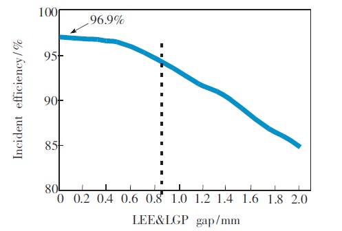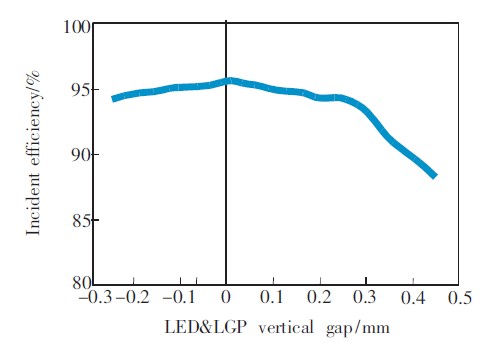 LED發(fā)光面和LGP入光面兩者之間的垂直距離通常會(huì)被忽略,但如果兩者之間的距離過大,也會(huì)嚴(yán)重影響入射效率。通過試驗(yàn)發(fā)現(xiàn),兩者之間的距離在±0.2mm范圍內(nèi)時(shí),入射效率變化緩慢,且保持在95%左右,所以控制LED發(fā)光面和LGP入光面的垂直距離在±0.2mm范圍內(nèi)即可。