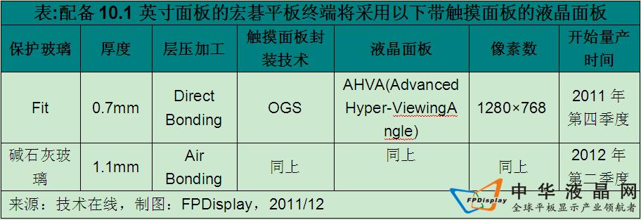 估計(jì)友達(dá)光電的月生產(chǎn)規(guī)模為1.5萬(wàn)~1.8萬(wàn)塊,成品率超過(guò)五成。厚度會(huì)比不采用OGS技術(shù)的產(chǎn)品減小3成。采用的玻璃為美國(guó)康寧稱為“Fit”的化學(xué)強(qiáng)化玻璃,F(xiàn)it雖不如“Gorilla”玻璃堅(jiān)固,但十分易于加工。宏?目前正考慮采用基于更易加工的堿石灰玻璃的液晶面板(下表)。