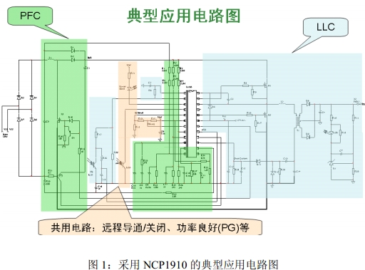 圖1是采用NCP1910的典型應(yīng)用電路圖共用電路,它包括遠(yuǎn)程PFC段、LLC段,以及實(shí)現(xiàn)導(dǎo)通/關(guān)閉、功率良好(PG)等的共用電路。