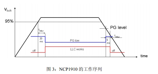 NCP1910的工作序列如圖3所示,如果PFC未就緒,LLC就不能啟動;一旦PFC就緒,就會開始一段20ms的延遲;延遲結(jié)束后PGout引腳假定為低電平,LLC可以開始工作。在撥除交流輸入關(guān)閉電源時(shí)Vbulk降低,到達(dá)PG信號時(shí),PGout引腳被釋放(開路);如果Vbulk到達(dá)LLC停止電平,LLC停止工作;或者如果Vbulk緩慢下降,如處在輕載狀態(tài),LLC會在PGout引腳被釋放5ms后停止工作。