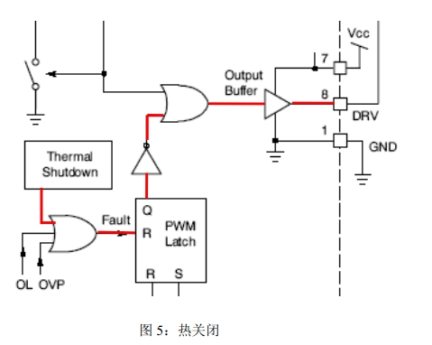 熱關(guān)閉(TSD):過熱保護(hù)功能有助于實(shí)現(xiàn)良好的電源設(shè)計(jì)。當(dāng)結(jié)點(diǎn)溫度超過140℃時(shí),該功能激活,驅(qū)動器變?yōu)榈碗娖剑唤Y(jié)點(diǎn)溫度降到典型值30℃時(shí)器件恢復(fù)工作。