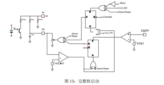 •在軟啟動或重啟時(shí),專用引腳將SS電容放電至地,從而提供平順的輸出電壓上升;在LLC被CS/FF引腳(>1V)或BO功能關(guān)閉時(shí),SS引腳給CSS放電,并提供純粹的軟啟動;
