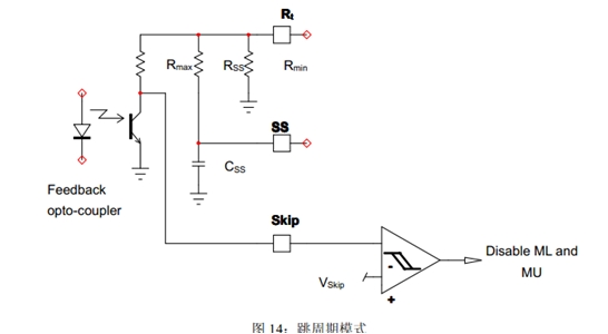 在下列情況時(shí),VLBO可下拉至2V(VLBO(PD)):VLBO高于2V(高線路電壓時(shí)),以及VCTRL處于最大值的時(shí)間長于4ms(tPFCflag);Vbulk低于額定輸出的95%時(shí)。PFCPowerBoost功能在啟動時(shí)被禁止;最長下拉持續(xù)時(shí)間的典型值為5ms(tLBO(PDlimit));在后續(xù)最少70ms時(shí)間(tLBO(PDblank))內(nèi),開關(guān)保持在開路狀態(tài)。