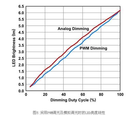 此外,驅(qū)動(dòng)器可達(dá)到較高的光電轉(zhuǎn)換效率,這表示耗用相同的電力可達(dá)到更高的流明。然而,模擬調(diào)光也有深度調(diào)光的某些電流準(zhǔn)確度問題,此因回饋調(diào)節(jié)電壓或電流汲入電壓過(guò)小,而無(wú)法準(zhǔn)確控制,此乃受限于錯(cuò)誤放大器的偏移電壓所致。亮度線性及色度也不比PWM調(diào)光,尤其是在深度調(diào)光時(shí)(圖5)。事實(shí)上,除非將兩個(gè)相同的顯示器并置進(jìn)行比較,否則一般人很難辨別色度或線性的差異。