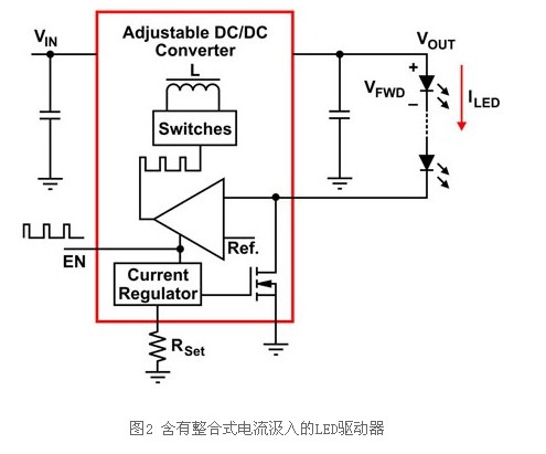 為了進(jìn)行PWM調(diào)光,數(shù)字信號(hào)處理器(DSP)或微控制器(MCU)會(huì)傳送不同負(fù)載周期(D)的PWM訊號(hào),以針對(duì)圖1所示的驅(qū)動(dòng)器啟用及停用WLED驅(qū)動(dòng)器的轉(zhuǎn)換器,或針對(duì)圖2所示的驅(qū)動(dòng)器啟用及停用電流汲入。因此,通過(guò)WLED串行的平均電流等于負(fù)載周期乘以最大電流,亦即ILEDavg = D×ILEDmax。