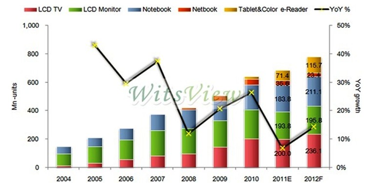 在low cost direct type LED TV、 3D TV 、super narrow bezel、 LED Monitor 、ultra slim module、high resolutiON、new TV sizes、high transmittance panel、 Windows 8 等新產(chǎn)品及新作業(yè)系統(tǒng)的帶動下,WitsView對于2012年大尺寸面板的需求抱持著審慎而樂觀的看法,預估年成長率將達12~14%,面板總量上看7億8,000萬片,其中平板電腦及彩色閱讀器面板的年成長率仍將超過60%,達1億1,500萬片。