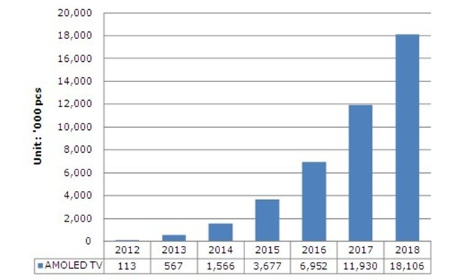 據(jù)NPD DisplaySearch分析,2011年OLED面板產(chǎn)值預(yù)計達40億美金,約為所有平板顯示器產(chǎn)值的4%;2018年則將創(chuàng)造超過200億美金產(chǎn)值,達到了所有平板顯示器產(chǎn)值的16%?此外, OLED應(yīng)用在照明上也自2011年開始起飛,OLED照明預(yù)計到2018年將達到60億美金產(chǎn)值。NPD DisplaySearch預(yù)測 AMOLED TV將于2017年達到1千萬臺以上的規(guī)模。雖然在AMOLED TV面板量產(chǎn)初期會有規(guī)模經(jīng)濟不夠、量產(chǎn)穩(wěn)定性不夠以及成本過高等問題,但在電視品牌廠商追求產(chǎn)品差異化的動機之下,預(yù)計將會有策略性的AMOLED TV訂價方式,以刺激終端市場消費者的購買動機。
