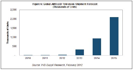 據(jù)IHS iSuppli公司的中小顯示器研究報告,2015年全球AMOLED電視出貨量預(yù)計將達到210萬臺,而2012年只有3.4萬臺。雖然增幅巨大,但到2015年AMOLED電視在全球平板電視市場中的份額仍然將只有1%。