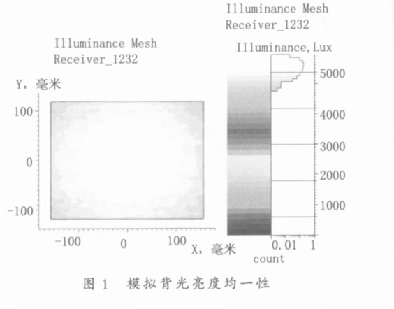 采用STAMPER 技術(shù),一體成型射出導(dǎo)光板,減少印刷環(huán)節(jié),較少印刷污染。以模具射出形成網(wǎng)點(diǎn),入射面設(shè)計(jì)能破壞光源的全反射,并控制光源射出導(dǎo)光板面角度的分布,網(wǎng)點(diǎn)數(shù)量的多少對光源做有效的控制。網(wǎng)點(diǎn)可隨模具任意設(shè)計(jì)形狀,若網(wǎng)點(diǎn)為極小的平滑鏡面,可使光在網(wǎng)點(diǎn)及導(dǎo)光板內(nèi)部的損失減至最小,應(yīng)用光學(xué)設(shè)計(jì)軟件進(jìn)行網(wǎng)點(diǎn)設(shè)計(jì)。圖1 所示為模擬的背光組件的亮度均一性。