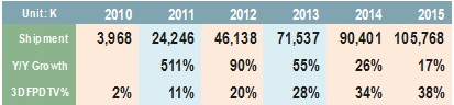 據(jù)NPD DisplaySearch調(diào)查液晶電視自2010年起開(kāi)始走向3D影像應(yīng)用,并且不同品牌間在發(fā)展3D技術(shù)上存在差異。但不論是快門(mén)式或偏光式,消費(fèi)者對(duì)3D電視的接受度還有待考量,市場(chǎng)上仍然不能說(shuō)已經(jīng)獲得了成功。2011年3D電視總出貨量約達(dá)2千4百萬(wàn)臺(tái),相較2億臺(tái)以上平板電視(包含液晶電視和等離子電視)的總出貨量而言,滲透率僅約11%,但成長(zhǎng)率卻高達(dá)511%。比起2010年品牌間對(duì)3D技術(shù)的激烈攻防戰(zhàn),2011年的3D電視戰(zhàn)爭(zhēng)少了些硝煙味,特別是三星將主力放在智能電視,樂(lè)金持續(xù)對(duì)薄膜式3D電視加碼促銷(xiāo),并與中國(guó)品牌達(dá)成聯(lián)合戰(zhàn)線(xiàn),將薄膜式3D技術(shù)的市場(chǎng)占有率逐漸提高。