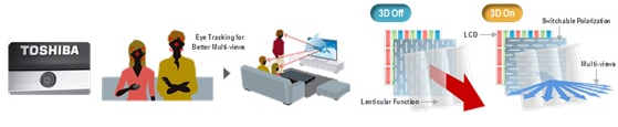 55X3具備3840x2160的高分辨率面板,3D模式時(shí)具備1280x720 HD的分辨率與9個(gè)視點(diǎn)。同時(shí)內(nèi)建兩顆強(qiáng)大的雙核心Cevo處理芯片以處理多視點(diǎn)影像(parallex images)運(yùn)算和畫(huà)質(zhì)升級(jí)(upscaling)。另外,55X3也具有眼球追蹤技術(shù),以便追蹤觀看者的位置來(lái)提供較合適的多視點(diǎn)影像。由于Toshiba的TMD面板廠(chǎng)并不具備大尺寸電視面板的生產(chǎn)能力,因此已經(jīng)與臺(tái)廠(chǎng)友達(dá)進(jìn)行技術(shù)合作開(kāi)發(fā)。雖然裸眼3D電視剛起步,成本也相當(dāng)昂貴,但是可以預(yù)期從2012年開(kāi)始,3D電視除了低價(jià)化以持續(xù)加大滲透率之外,裸眼3D技術(shù)也將為未來(lái)3D電視立下新的競(jìng)賽里程碑。