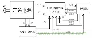 電視顯示系統(tǒng)包括電源板、主板、背光驅動板等, 電源板提供VLED、12V給背光板,主板提供背光控制信號BL_ON和調光PWM信號給背光板。背光驅動ICOZ9906 檢測PANEL內部五條燈條的流過的電流,進行定電流和電流平衡控制,點亮背光系統(tǒng)。
