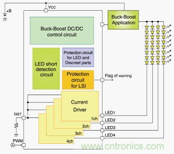 近年來,在車載用顯示器領域,為滿足有害物質限制要求,使用水銀的CCFL背光燈正在被LED背光燈迅速取代。另外,儀表盤、汽車導航、音響顯示、后座娛樂等各種車載用顯示器正朝多樣化、大型化方向發(fā)展。在這種趨勢下,對于增加LED燈數(shù)量以及高亮度、高調(diào)光率的要求日益高漲。ROHM為滿足LED燈數(shù)量增加的這種發(fā)展趨勢需求,將實現(xiàn)高耐壓的升降壓DC/DC轉換器、可多燈驅動小功率LED且實現(xiàn)了高調(diào)光率的電流驅動器電路內(nèi)置于一枚芯片,擴充了LED驅動器產(chǎn)品陣容。