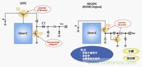 圖2的SEPIC結構中,C1對于輸出電壓像電荷泵一樣工作,因此,Q1需要達到DC/DC轉換器輸出電壓(VOUT)+電池電壓的耐壓水平。另一方面,REGSPIC結構中,由于耐壓達到DC/DC轉換器輸出電壓和電池電壓二者較高一方以上即可,因此,REGSPIC結構由低耐壓部件組成,更容易控制。