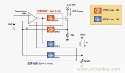 這兩條反饋通路由各SW進行切換。在PWM=High(LED為ON)區(qū)間,驅動LED電流輸出用的反饋電路(圖3反饋電路1),由LED引腳灌入LED電流。在PWM=Low(LED為OFF)區(qū)間,驅動另一條反饋電路(圖3反饋電路2),由內(nèi)部恒定電壓VREG產(chǎn)生電流。通過進行這樣的控制,LED電流雖然是關斷的,但電流驅動放大器始終處于驅動狀態(tài),PWM=Low→High時可平穩(wěn)生成LED電流。由于反饋通路2的電流I2已設定為數(shù)μA,因此,本電路結構的功耗增加量已達到可以忽視的水平。