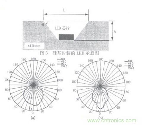 MEMS技術(shù)是隨著半導(dǎo)體和微電子技術(shù)的發(fā)展麗發(fā)展起來的一項(xiàng)新興的細(xì)微加工技術(shù),加工尺寸從毫米到微米數(shù)量級(jí),甚至亞微米的微小尺寸:其加T藝主要分為表面工藝和體工藝?;诠杌捏w工藝又稱為體硅工藝,體硅工藝呵以在硅基體上形成高深寬比的凹稽。由于MEMS的加工尺寸很小,因此利用該技術(shù)形成的微小凹槽作為L(zhǎng)ED芯片封裝的反射腔(如圖3),將會(huì)克服目前LED芯片直接封裝在PCB板上而引起發(fā)光效率低的問題;同時(shí)由于硅具有良好的導(dǎo)熱特性,因此可以降低目前封裝中熱阻高的問題,從而提高LED芯片的發(fā)光效率和可靠性。圖4(a)和(b)給出了當(dāng)LED芯片直接貼裝在PCB板上和貼裝在有凹槽的硅基上的發(fā)光特性。從圈中可以看出,LED貼裝在帶有凹槽的硅基上以后其發(fā)出光的發(fā)散性能得到了很大的改善,LED的發(fā)光強(qiáng)度提高了75%以上。