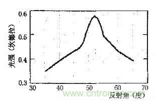圖5為L(zhǎng)ED發(fā)射光與反射的反射角θ之間的關(guān)系,從圖中可看出當(dāng)反射角為52度的時(shí)候反射光強(qiáng)取得最大。從理論上講,硅凹槽反射角應(yīng)該設(shè)計(jì)為52度。但是,考慮到對(duì)(100)硅進(jìn)行腐蝕的時(shí)候,其(111)面和(100)面會(huì)自動(dòng)形成一個(gè)54.7度的角,而通過仿真分析結(jié)果可以計(jì)算。當(dāng)反射角為54.7度的時(shí)候。LED的反射光強(qiáng)只比反射角為52度的時(shí)候小12%,而且光強(qiáng)分布也比較接近。因此在腐蝕凹槽的時(shí)候可以直接采用硅的(100)面和(111)面形成角度作為反射角,這可以極大的簡(jiǎn)化加工工藝,降低制造成本,而且對(duì)LED光強(qiáng)的影響也不是很大。
