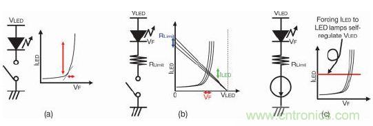 現(xiàn)在我們來(lái)看看圖1b。添加一個(gè)限流電阻器RLIMIT來(lái)保護(hù)LED燈。由于有限流電阻器,因此該燈不會(huì)被燒壞。在視頻顯示器應(yīng)用領(lǐng)域,這種方法在控制LED光強(qiáng)度方面仍然不夠好。LED曲線和RLIMIT產(chǎn)生的負(fù)載曲線可決定其LED電流值。如紅色或藍(lán)色標(biāo)記所示,該LED和電阻器分別存在制造誤差造成的正向電壓變化及電阻變化。這些誤差因素會(huì)使LED電流(綠)產(chǎn)生不可忽視的變化。